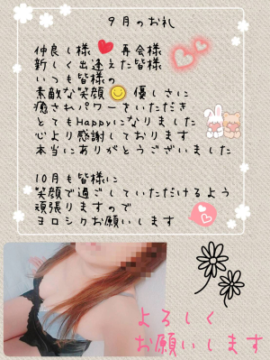 女の子から | お会いする貴方様とのエッチで素敵な時間を過ごせたら嬉しいと思っています。 沢山お会いした皆様の心も体も癒せるように精一杯頑張りますので、どうぞよろしくお願いします。 |